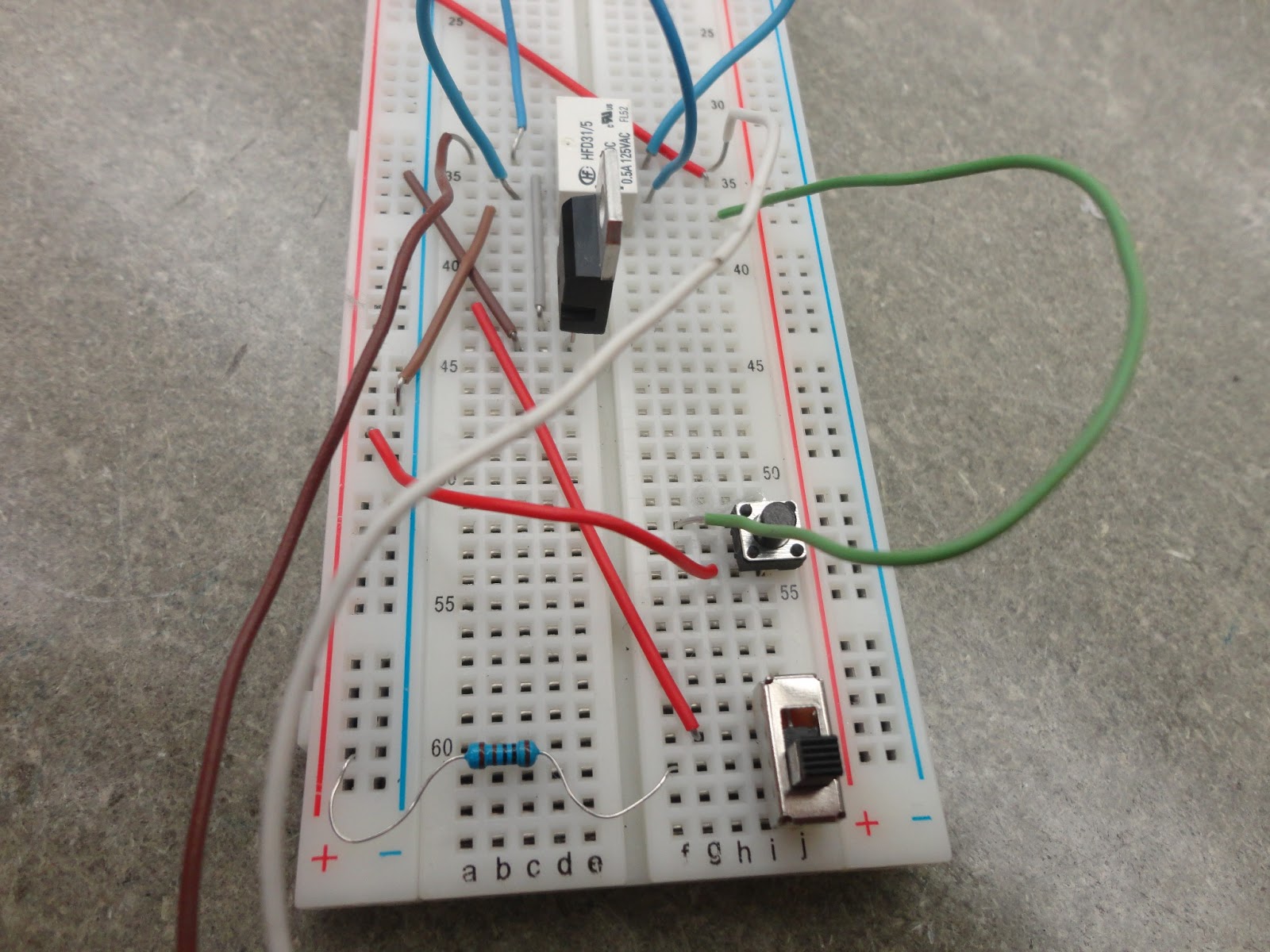 For the programming, I created a variable named "counter" to use the pushbutton switch (on the head) to increase the counter and change between modes. The motor has hardware stops preventing full rotation. Therefore I used a DPDT Relay to change the direction of the motor. On the breadboard is a yellow LED which is lit when a process is in progress. During this time, the switch will not increase the counter. A 100 Ohm resistor is used in series with the speaker. A 4.7kOhm connected to the pin and a 10kOhm resistor connected to ground is used on the switch operator. Lastly, a 2.2kOhm resistor is used for the TIP120 transistor, which amplifies the current enough to run the motor.